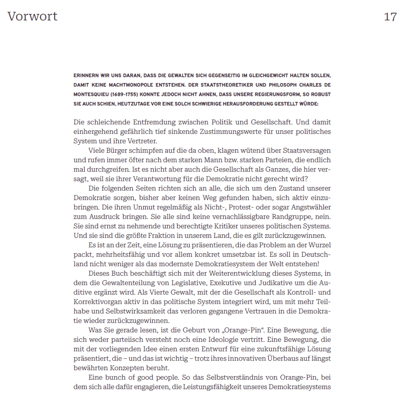 Das fertige Werk besteht zum einen aus parteitheoretischen Erklärungen, vor allem aber aus narrativen Kapiteln. Hier wird dem Leser mit mehreren Parabeln die tiefere Bedeutung des politisches Zwecks näher gebracht: Die Modernisierung und damit Stärkung unserer Demokratie.